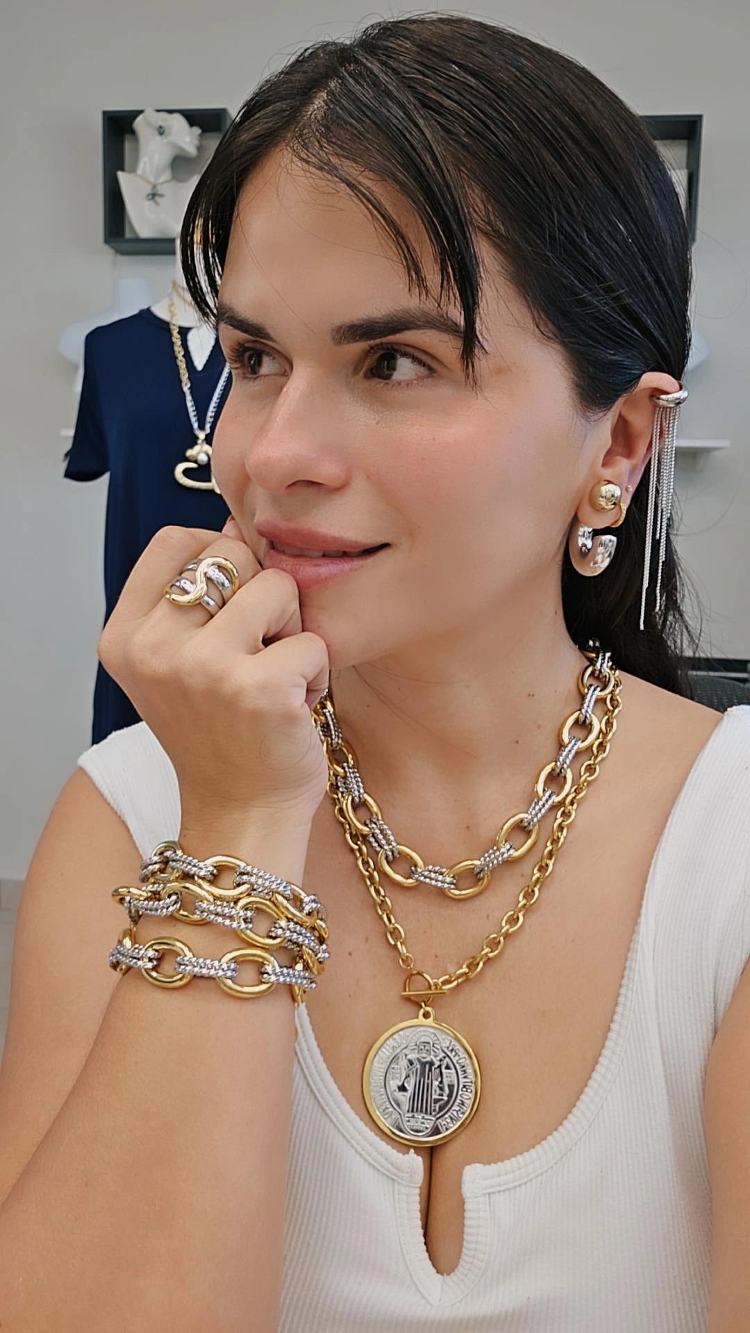 Sera enviada a finales de Diciembre. Solo incluye la cadena dos tonos en stainless steel ajustable hasta 19 pulgadas. No incluye cadena san benito